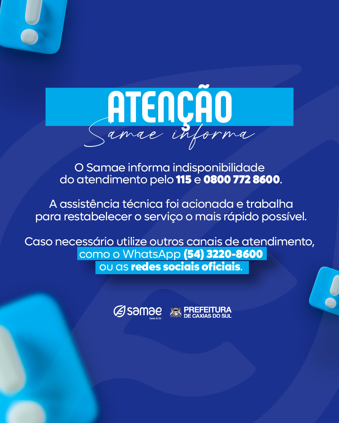 O Samae informa indisponibilidade do atendimento pelo 115 e 0800 772 8600 nesta segunda-feira (23/02).